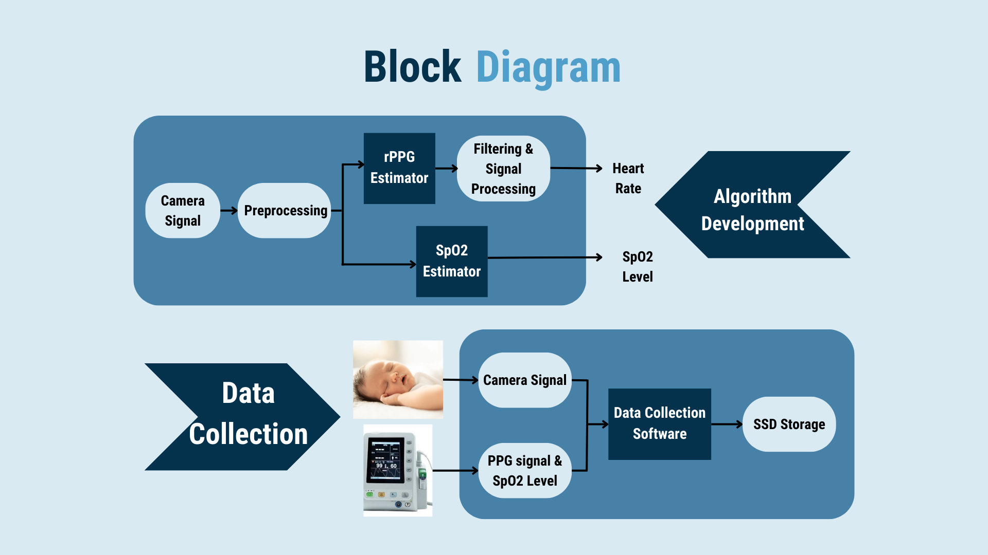 Developing a non-invasive system for neonatal physiological monitoring using rPPG technology, focusing on heart rate and blood oxygen saturation extraction from video data.